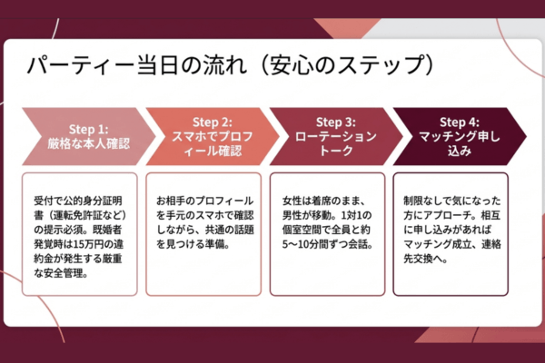 A. 利用規約により、既婚者と判明した場合は違約金15万円が発生します。当日の公的身分証提示は全参加者に義務づけられており、厳格な本人確認を実施しています。